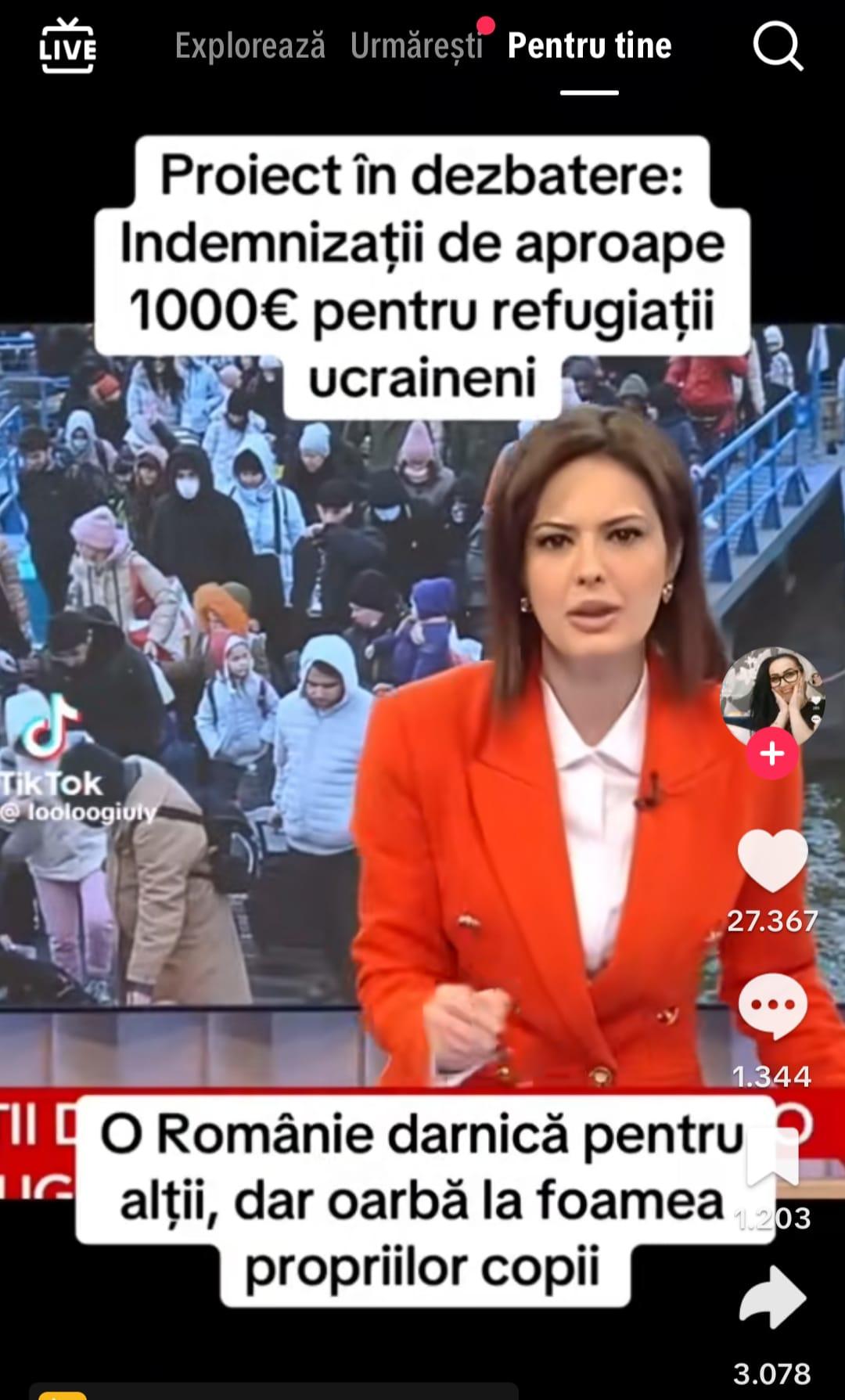 Sprijinul actual face parte din asistența umanitară obligatorie, conform legislației UE (arhivat aici). Bugetele guvernamentale provin de la contribuabili, așadar finanțarea legitimă a programelor sociale și umanitare depinde parțial de fonduri publice, dar asta nu înseamnă că sunt bani „luați de la români", cum interpretează vorbitoarea din clipul TikTok. Românii beneficiază de o serie de forme de sprijin financiar precum alocația pentru copii, ajutorul social (venitul minim de incluziune), indemnizația de șomaj, pensiile, voucherele pentru alimente și energie sau subvențiile pentru chirie, energie și încălzire, toate separate de programele destinate refugiaților ucraineni (arhivate aici, aici, aici și aici).