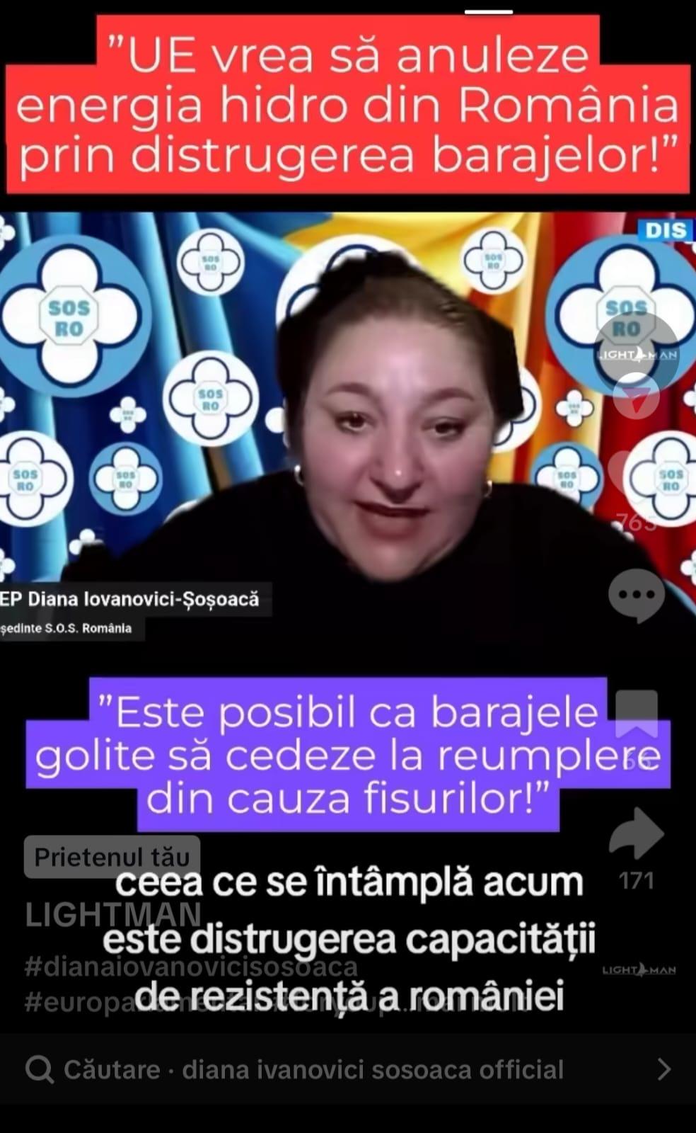 Afirmația că Uniunea Europeană dorește să anuleze producția de hidroenergie din România prin distrugerea barajelor sale este falsă și înșelătoare. În primul rând, informațiile sunt răspândite de către Șoșoacă, europarlamentar și politician de extremă dreapta, persoană căreia i-a fost interzisă de două ori candidatura la alegerile prezidențiale din România de către Curtea Constituțională (CCR) din cauza unui discurs instigator la ură și discriminare și prin prisma mai multor informații false propagate, de-a lungul timpului, către publicul larg (arhivat aici). O parte dintre acestea au fost documentate, periodic, și de echipa Lead Stories (linkuri aici, aici și aici).